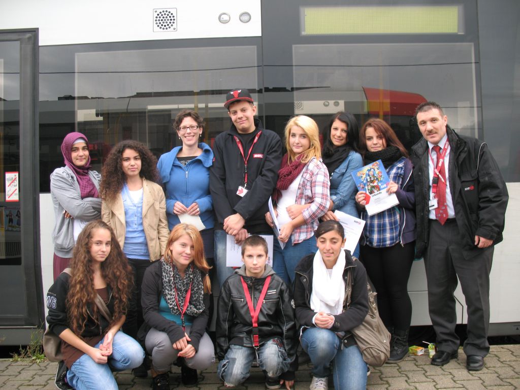 „Na klar helfe ich, wenn eine Frau mit Kinderwagen in die Bahn einsteigt, “ ruft Lisa (14 J.). „Ist doch selbstverständlich.“ Diese Selbstverständlichkeit kommt nicht von ungefähr: Über mehrere Wochen übten Mitarbeiter der KVB mit Lisa und ihre Mitschülern Fairness und Zivilcourage. Nun dürfen sich die Schüler „KVB-Fahrzeugbegleiter“ nennen. Die Ausbildung zum Fahrzeugbegleiter geht über mehrere Wochen, das Training findet nicht nur an der Schule, sondern auch in authentischer Atmosphäre statt: Für die Rollenspiele nutzte die Gruppe einen Stadtbahnwagen auf dem Wesselinger Werkstattgelände. Dabei lernten die Schüler, in brenzligen Situationen angemessen zu reagieren. Jedoch: Die Schüler sollen sich nicht in Gefahr begeben. Eine der wichtigsten Regeln der Fahrzeugbegleiter lautet: Im Zweifelsfall besser nicht selbst eingreifen, sondern den Fahrer verständigen. Und noch eine weitere Regel vereinbarten die KVB-Mitarbeiter mit den Schülern: „Wir sprechen nur Gleichaltrige an“, so Vero (14 J.), „Erwachsene sind tabu.“